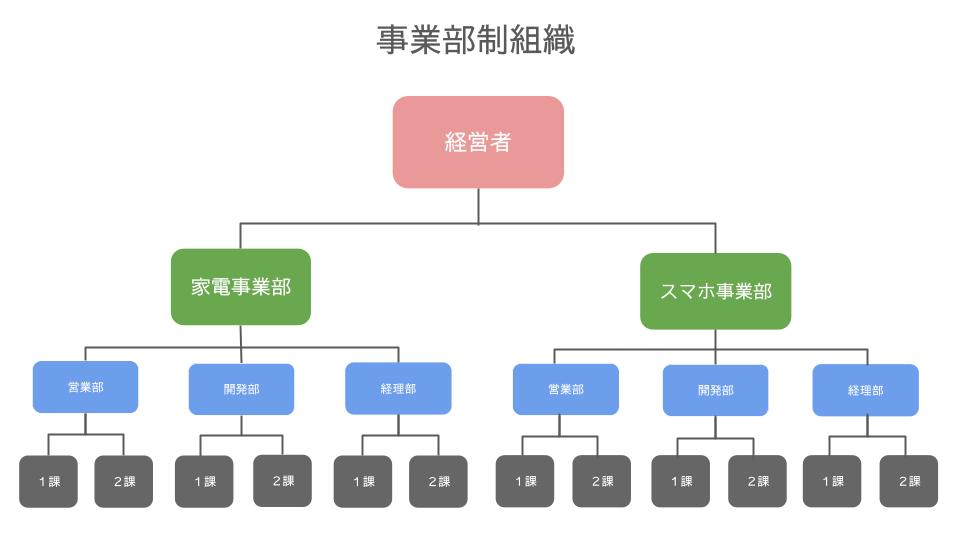 機能別組織が営業部、開発部、経理部など機能ごとに部門を分けるのに対し、事業部制組織は家電事業部、スマホ事業部といった事業単位で編成されます。