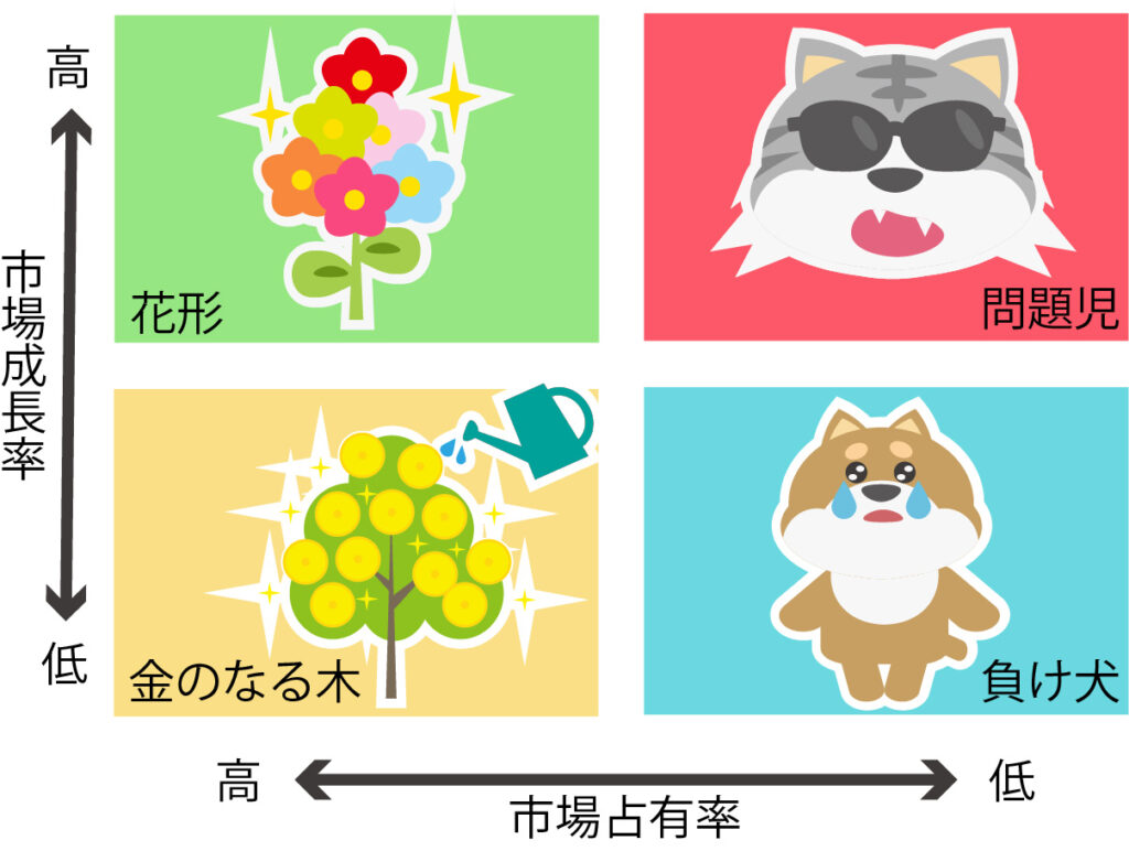 その枠組みは、市場成長率と相対的市場シェアの2軸で分類され、代表的な分類は以下の4象限です。